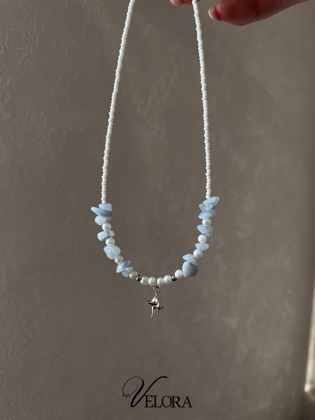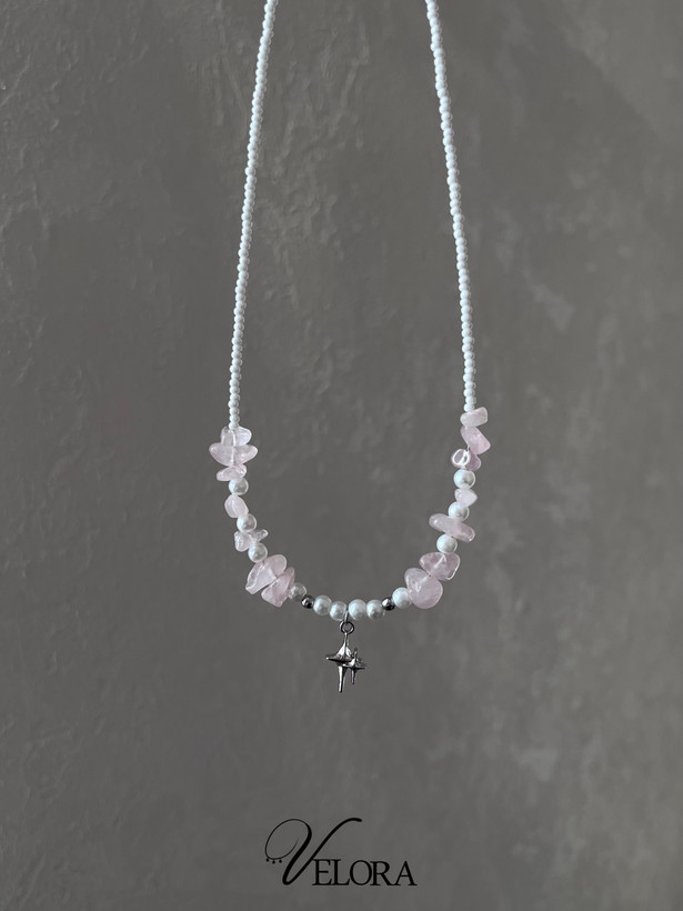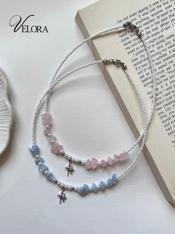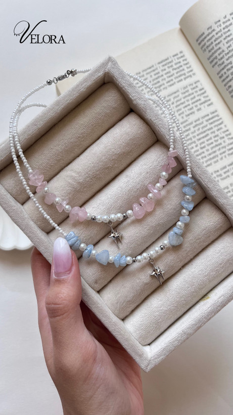 گردنبند اسپارکل با سنگ رز کوارتز صورتی و آکوامارین آبی🩵